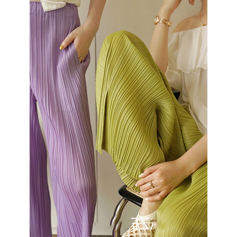 Celana kaki lebar berlipat wanita, Bawahan kasual ramping pinggang tinggi gaya Korea ukuran besar musim panas dan semi
