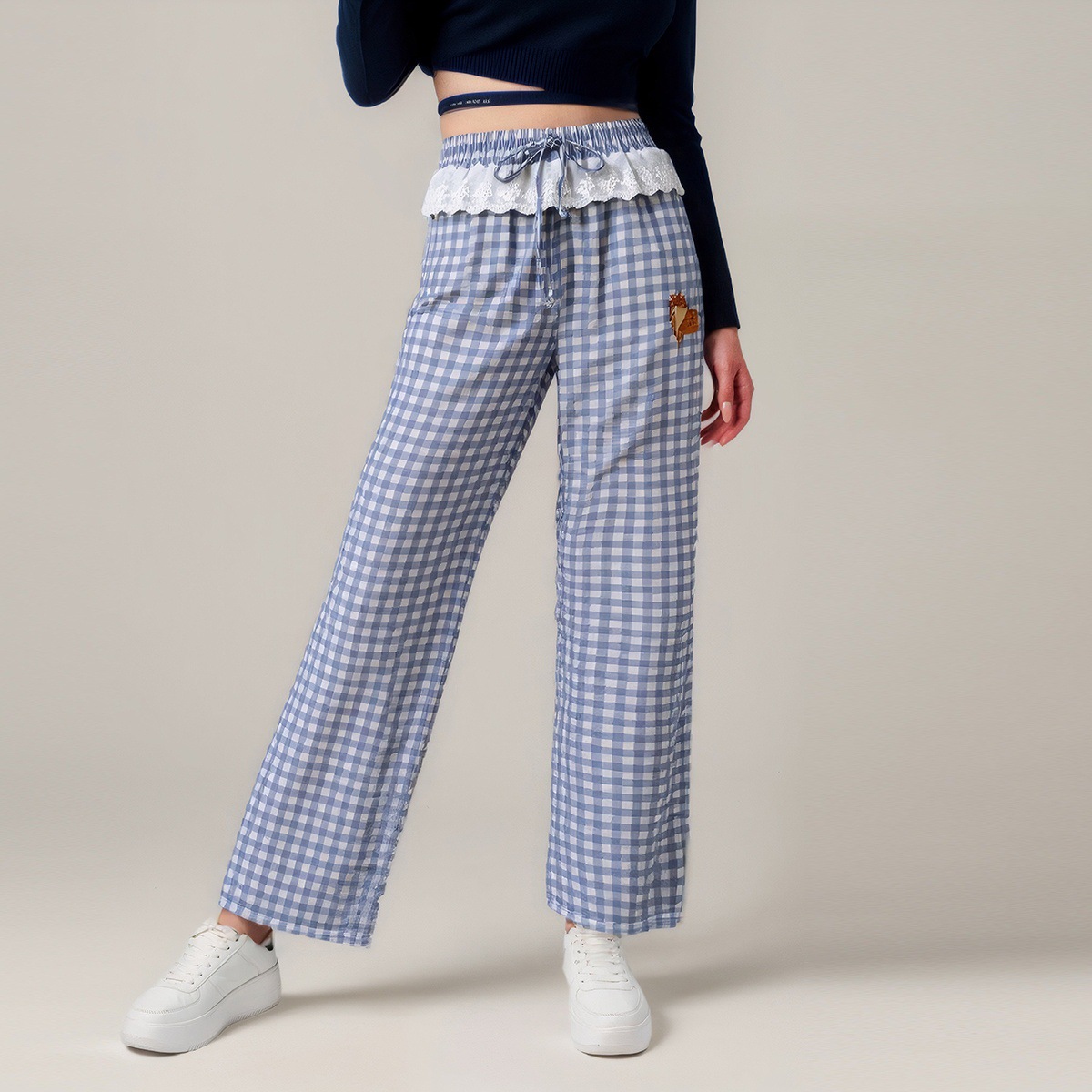 2025 Crossborder Amazon Model Baru Pakaian Wanita Desain Renda Pola Kotak Fashion Kasual Celana Lurus PG9772