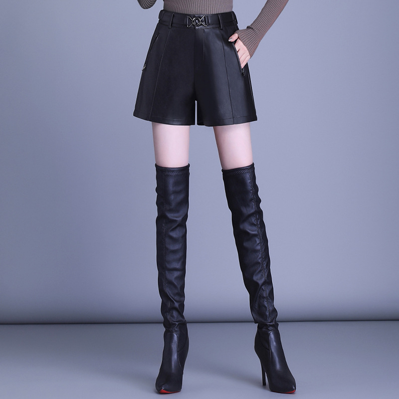 Celana pendek kulit PU wanita, Bawahan kasual bulu Haining musim gugur dan musim dingin 2023 ukuran besar bottoming sederhana pinggang tinggi ukuran besar