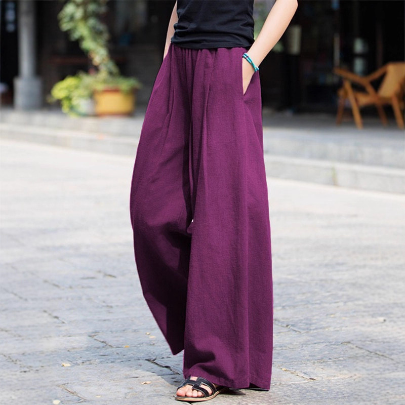 Celana Panjang Linen Ukuran Besar Musim Panas Celana Lurus Kasual Mengepel lantai dengan Pinggang Elastis Musim Semi Musim Gugur Wanita Celana Kaki Lebar Katun Linen