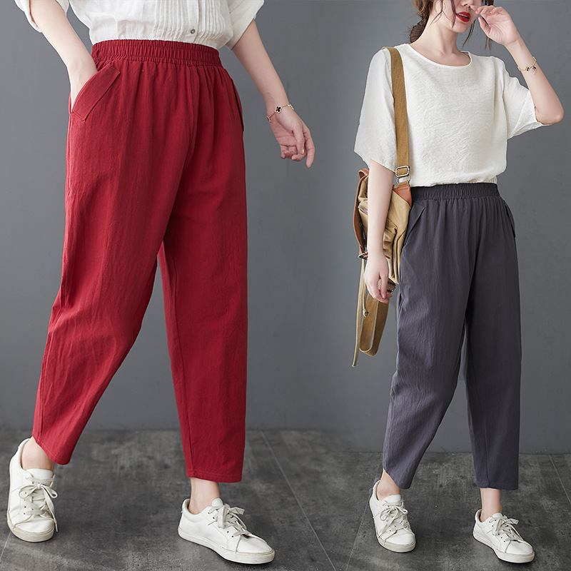Celana wanita katun ukuran besar celana kasual harem longgar celana lobak gaya baru musim semi celana crop katun imitasi dan linen