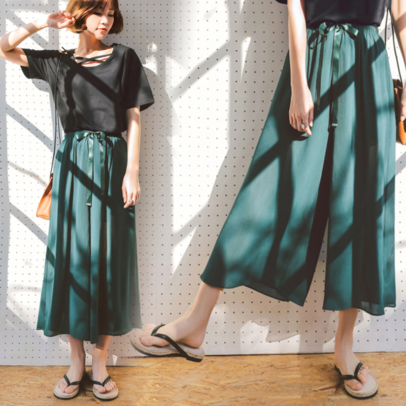 Celana kaki lebar sifon untuk wanita, celana kulot kasual elegan longgar ukuran plus, celana kaki lebar sifon Motif stasiun Eropa baru musim semi dan musim panas 6297