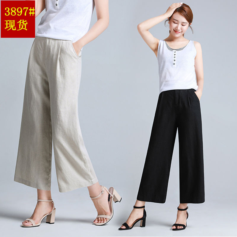 Celana Panjang Kaki Lebar Katun Linen Wanita Musim Semi Musim Gugur Musim Panas Pinggang Tinggi Ukuran Besar Celana Sembilan Persepuluh Linen Celana Kasual Tipis Lurus Tali Serut