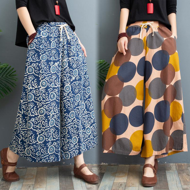 Celana Rami tipis musim panas wanita katun dan rami celana cetak kaki lebar celana longgar delapan celana wanita ukuran besar celana kaki lebar