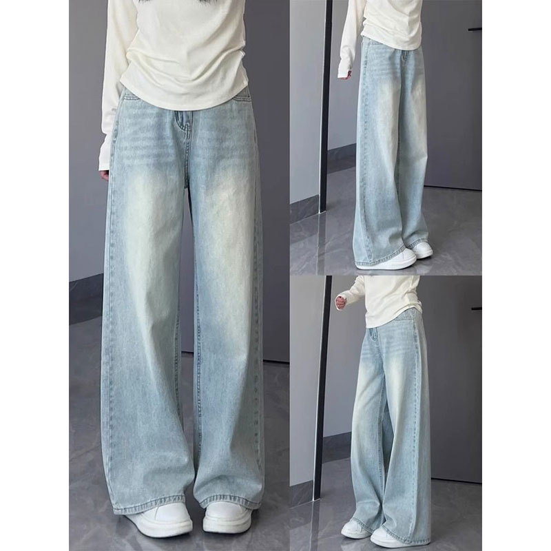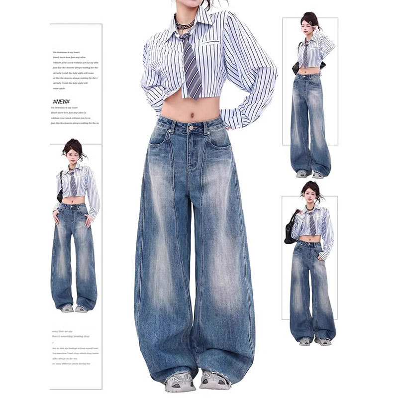 Celana jins wanita, celana jins kaki lebar wanita, desain pinggang tinggi, label, celana lurus, longgar, ukuran plus, celana panjang pel