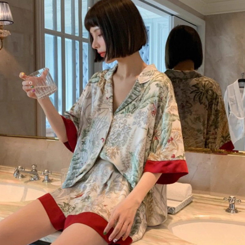 Setelan piyama wanita lengan pendek, pakaian rumah piyama sutra es tipis lengan pendek sutra Musim Panas 2024
