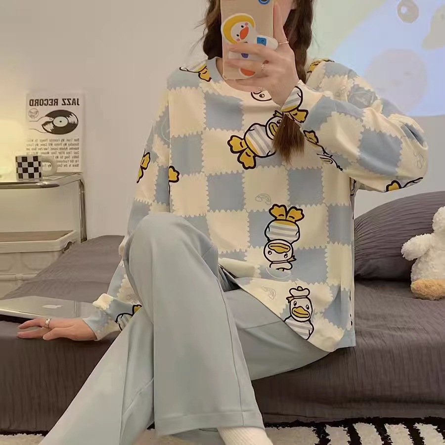 睡衣女春秋款高级感可爱卡通长袖长裤新款大码少女鸭鸭家居服套装