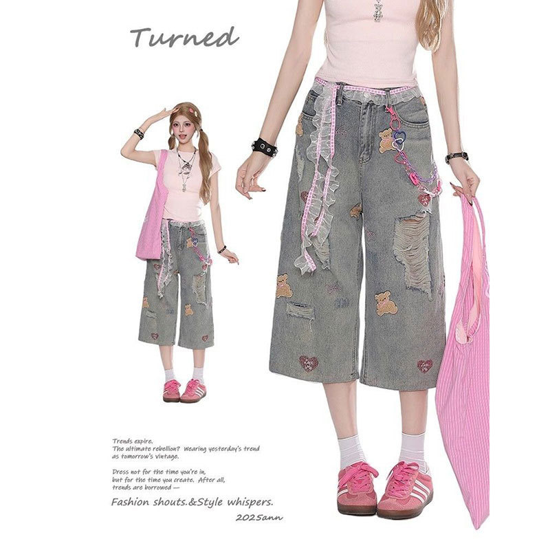 Celana Pendek Denim Berlubang Bordir Beruang Kecil Celana 7/8 Kaki Lebar Pinggang Tinggi Gaya Amerika Terlihat Langsing Ukuran Besar Longgar Model Baru Musim Panas