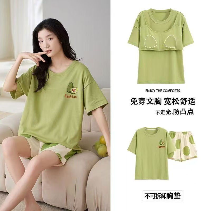 2025夏季女士睡衣女夏短袖短裤自带胸垫一体可外穿吸汗大码家居服