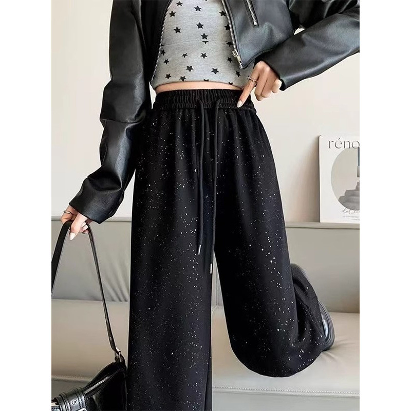 Celana Kaki Lebar Berbintang Ukuran Besar 300Kg Wanita Celana Santai Santai Longgar Lurus Terlihat Langsing Pinggang Tinggi Model Tipis Musim Semi Musim Panas