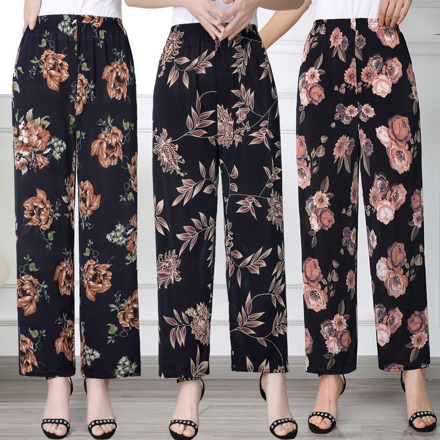 Celana wanita paruh baya dan lansia, celana bunga tipis musim panas, celana wanita longgar ukuran plus, celana nenek potongan sutra es