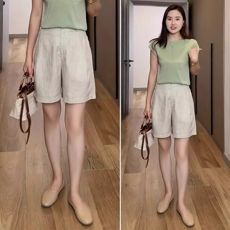 Tisi Celana Pendek Kasual Linen Celana Lurus Wanita Longgar Terlihat Kurus Pinggang Tinggi Ukuran Besar Wanita Gemuk Model Tipis Musim Panas 2025
