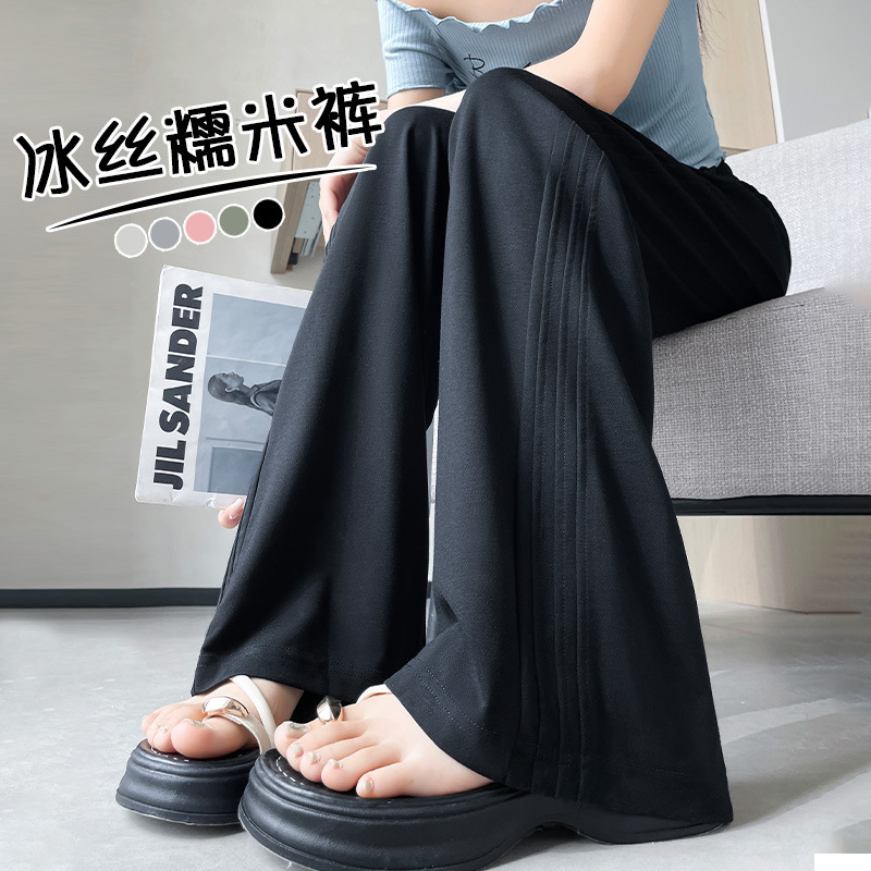 Celana Kasual Pel Lurus Model Tipis Musim Panas Celana Lebar Olahraga Terlihat Kurus Longgar Wanita Celana Beras Ketan Dingin Sutra Es Ukuran Besar