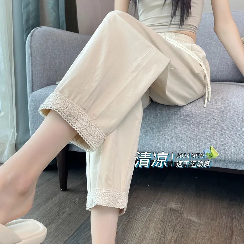 Celana Kaki Lebar Wanita Gemuk Ukuran Besar Celana Kasual Tabir Surya Model Tipis Musim Panas Celana Lurus Sutra Es Celana Olahraga Mengikat Kaki Cepat Kering