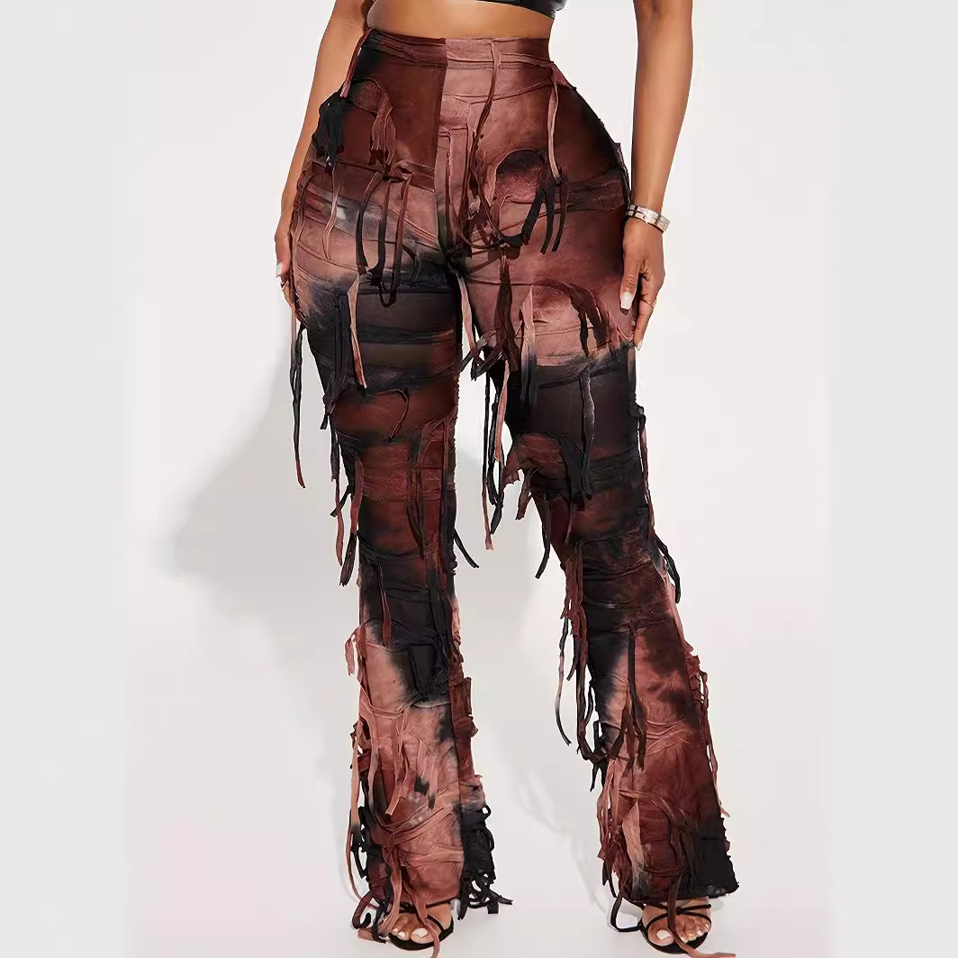 JFL053 celana panjang kasual rumbai pinggang tinggi wanita celana panjang ikat celup warna kontras kepribadian pinggang tinggi modis gaya Eropa dan Amerika