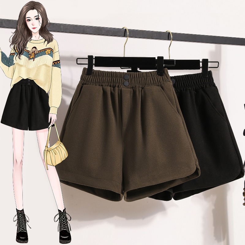 Celana pendek wol wanita, ukuran besar pinggang elastis baru musim dingin gadis gemuk kasual celana kaki lebar celana a-line celana bot pakaian luar