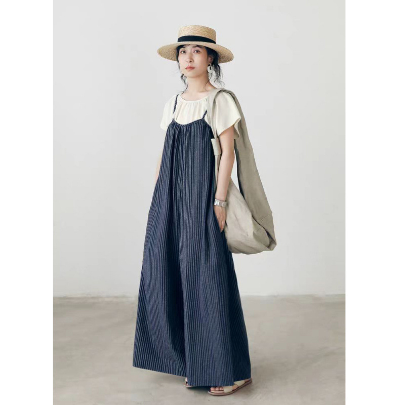 Celana Panjang Celana Kaki Lebar Terlihat Ramping Kasual Longgar Xiaozhong Musim Panas Wanita Gaun Suspender Garis-Garis Retro Seni 2025