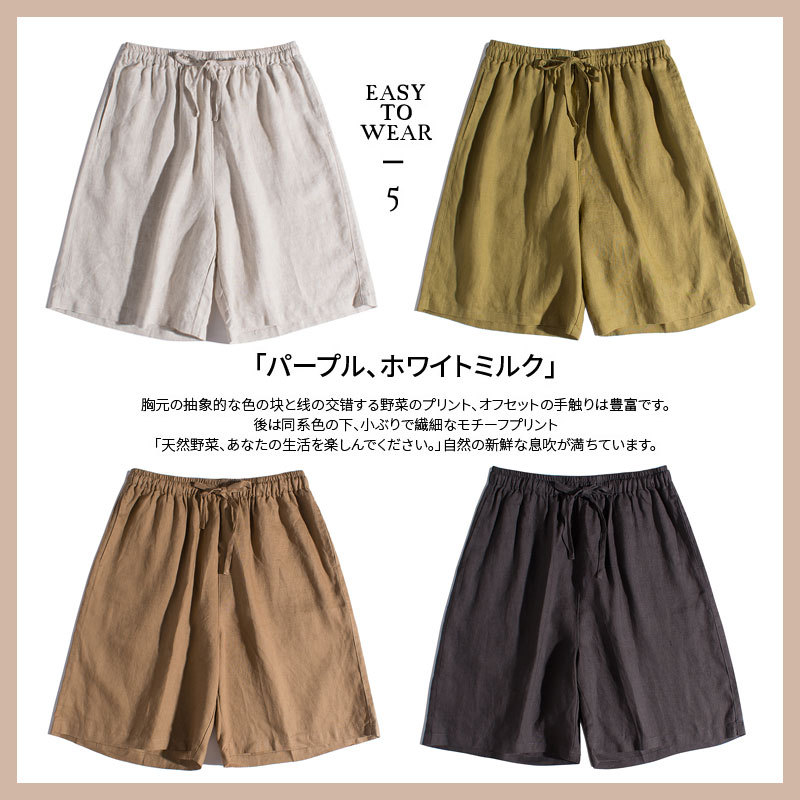 Celana pendek kaki lebar wanita, kulot longgar langsing pinggang elastis linen murni Prancis 14 untuk musim panas #167