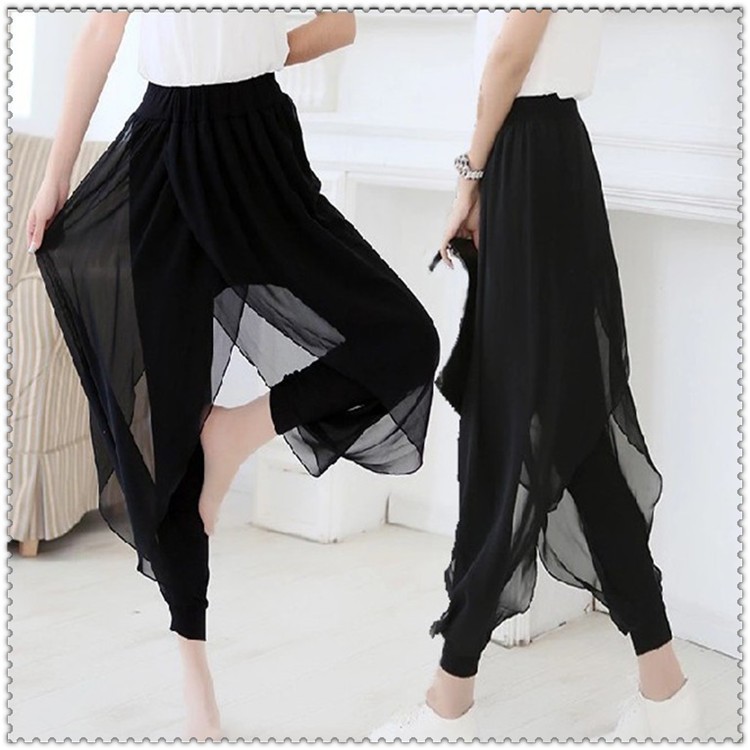Celana harem sifon dua potong gaya Korea, celana harem kasual warna polos, celana yoga dua potong palsu ukuran besar musim gugur