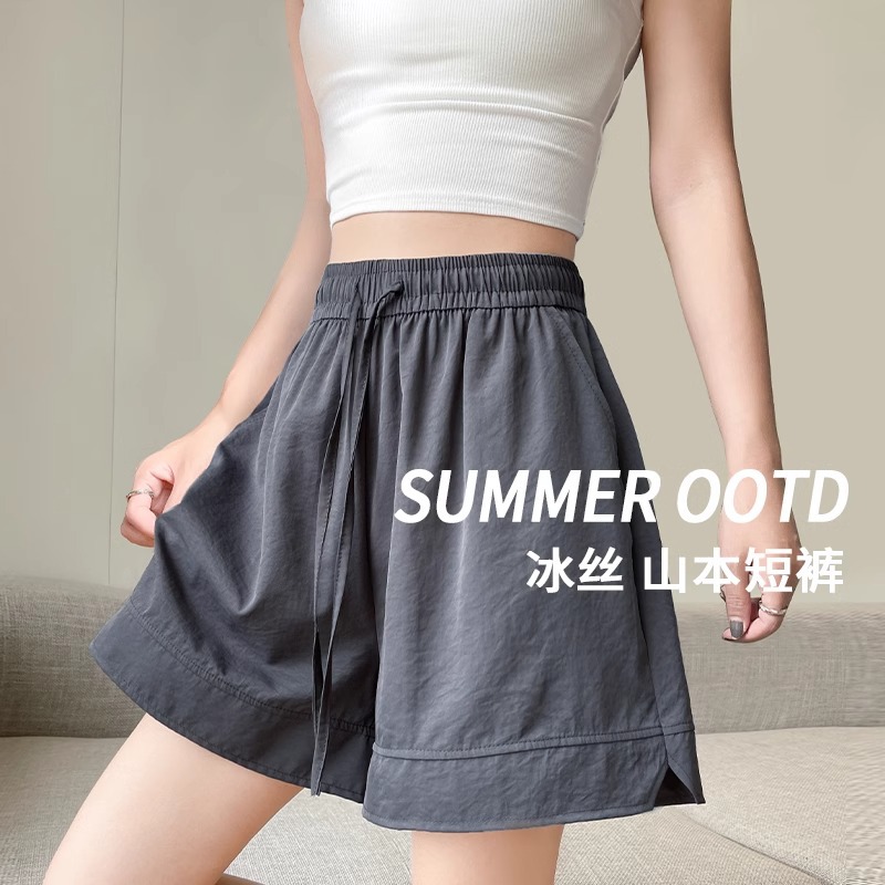 Celana Pendek Wanita Warna Abu-abu Es Sutra Yamamoto Musim Panas 2025 Model Baru Dipakai Luar Ukuran Besar Kasual Longgar Cepat Kering Celana Setengah Perempat