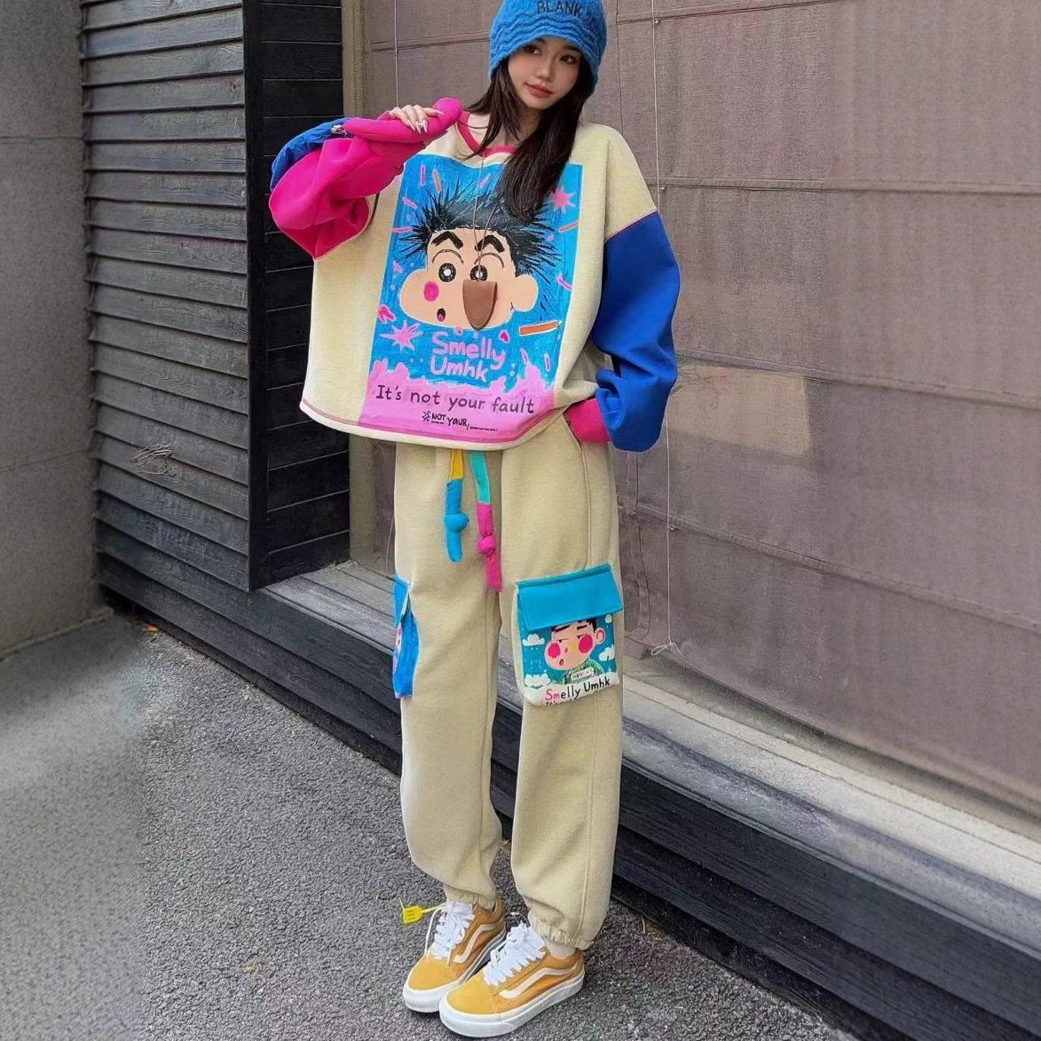 甜酷大码套装拼接涂鸦卫衣束脚口袋卫裤女卡通减龄洋气宽松两件套