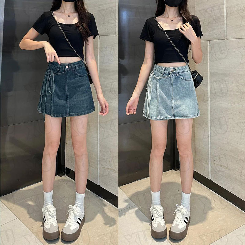 Rok Celana Dua Potong Palsu Warna Biru Muda Pinggang Tinggi Ukuran Besar Wanita Gemuk Model Baru Pria Kecil Celana Pendek Denim Wanita Rok Pendek Terlihat Kurus Musim Semi Musim Panas