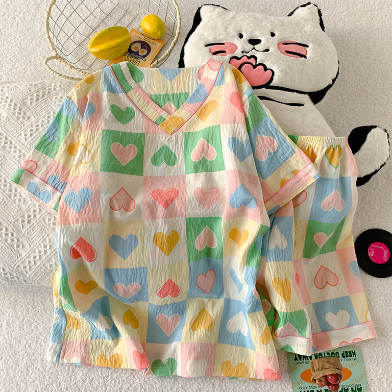 Musim Panas Yundo Katun Lengan Pendek Kerah V Celana Pendek Piyama Wanita Pakaian Rumah Nyaman Warna Warna-warni Manis Setelan Banyak Model