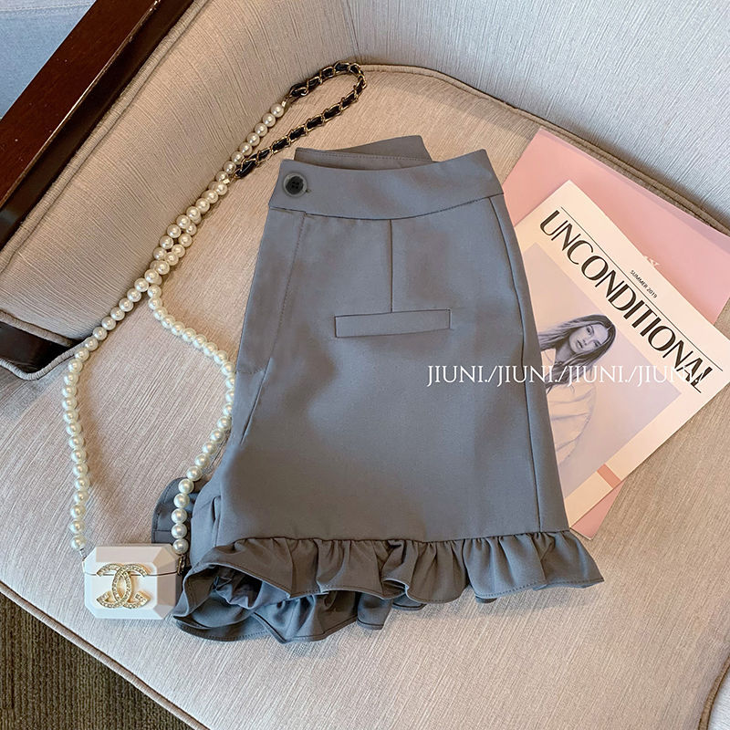 Celana Pendek Kasual Pinggir Daun Teratai Warna Abu-abu Ukuran Besar Khusus 300Kg Wanita Gemuk Celana Mengurangi Usia Terlihat Langsing Membentuk Tubuh Pinggang Tinggi Musim Panas