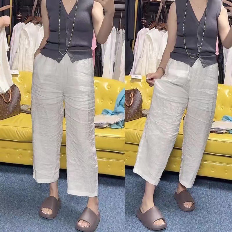 Celana Kaki Lebar Katun Celana Kasual Lurus Wanita Celana Sembilan Persepuluh Longgar Pinggang Tinggi Celana Tali Serut Celana Tai Chi Pakaian Zen Ukuran Besar Rasa Terjatuh Musim Gugur