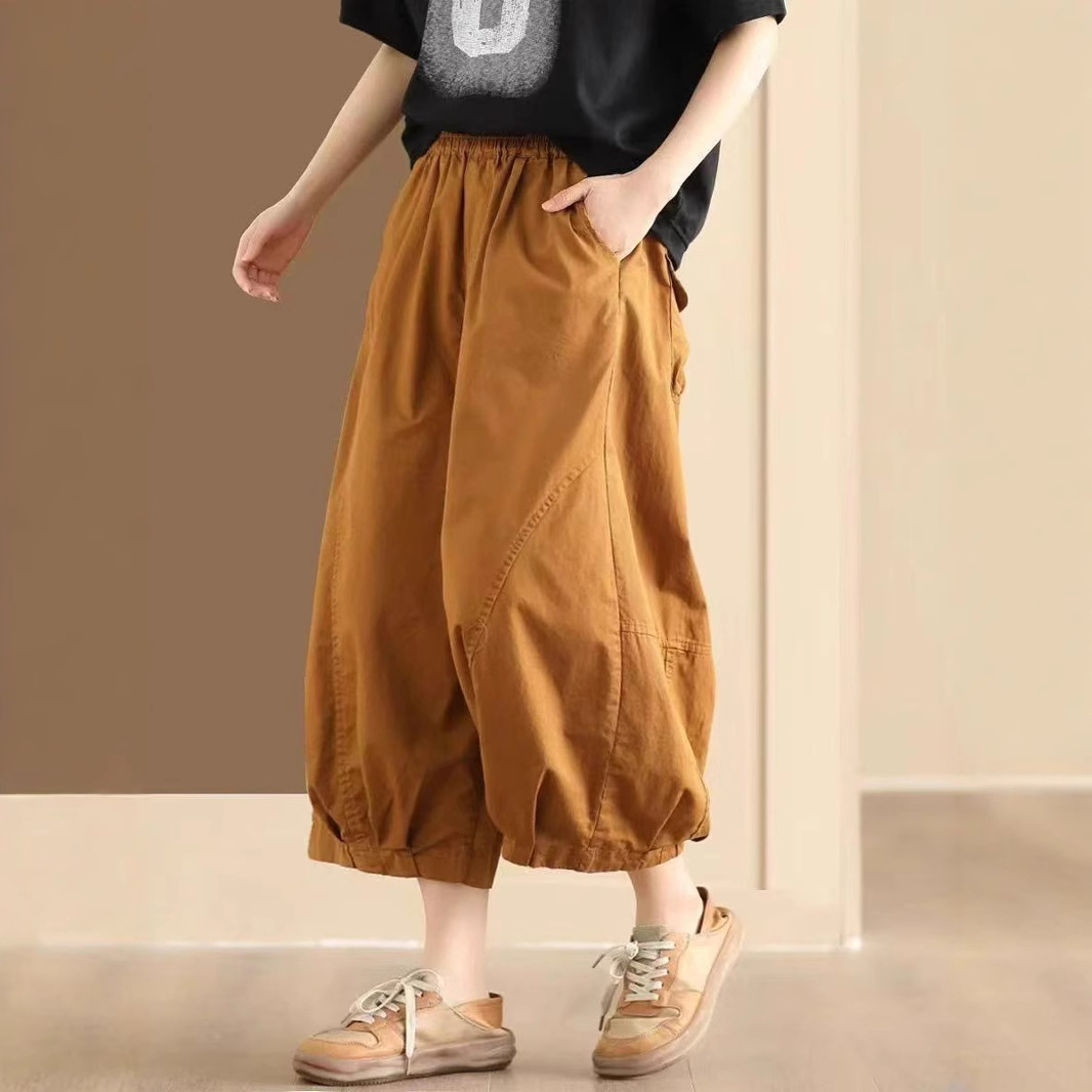 Celana kulot kaki lebar crop baru musim semi dan musim gugur celana kasual ukuran plus retro artistik wanita warna solid pinggang elastis 8873