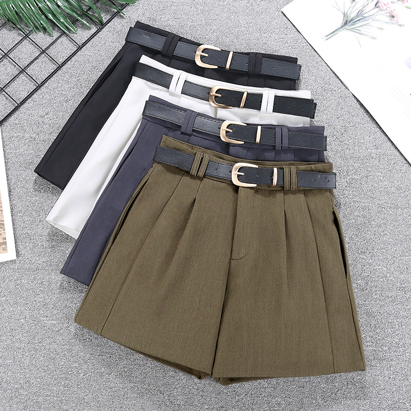 Real shot celana kaki lebar a-line untuk wanita, 2024 Korea Selatan Dongdaemun pakaian luar pelangsing pinggang tinggi setelan celana pendek dengan sabuk 9010
