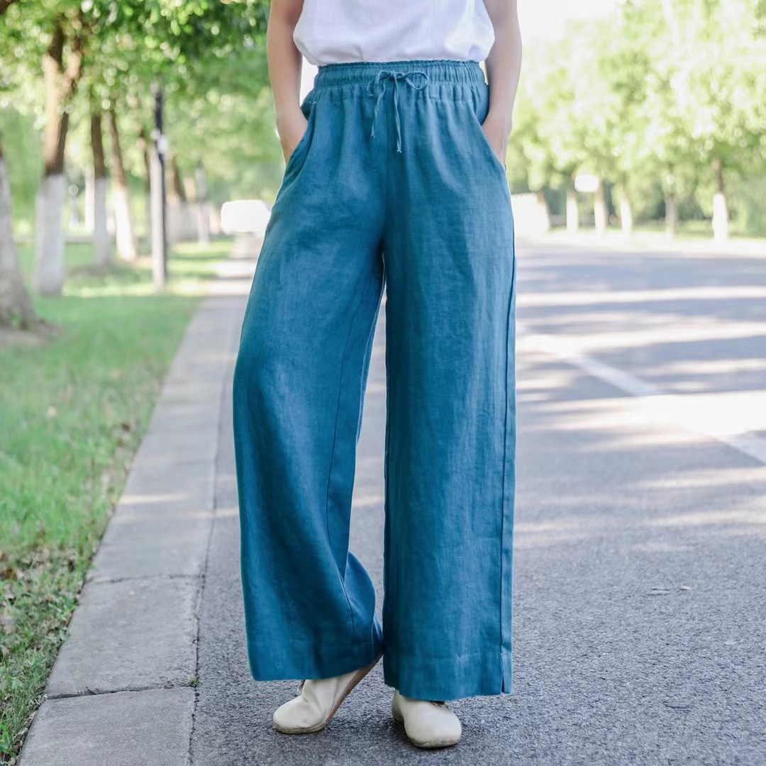 Celana kaki lebar Linen celana kasual tipis musim panas celana panjang lurus wanita katun pelangsing longgar dan linen tirai wanita pinggang tinggi