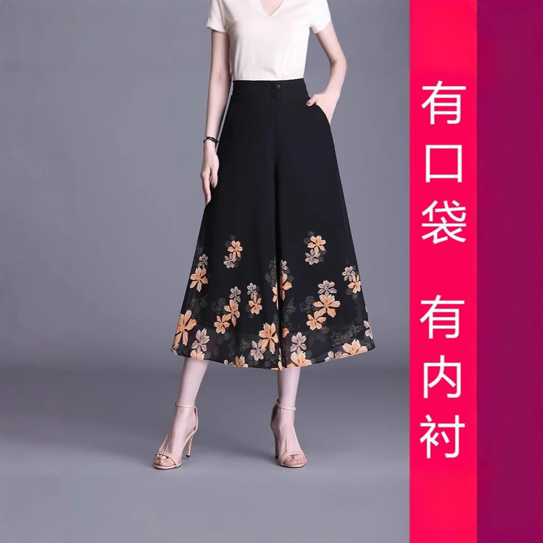 Celana Kulot Wanita Motif Cetak Sifon Celana 7/8 Gaya Melangit Pinggang Tinggi Musim Panas Celana Lebar Kaki Tipis Celana Kasual Kaki Besar Longgar Ukuran Besar