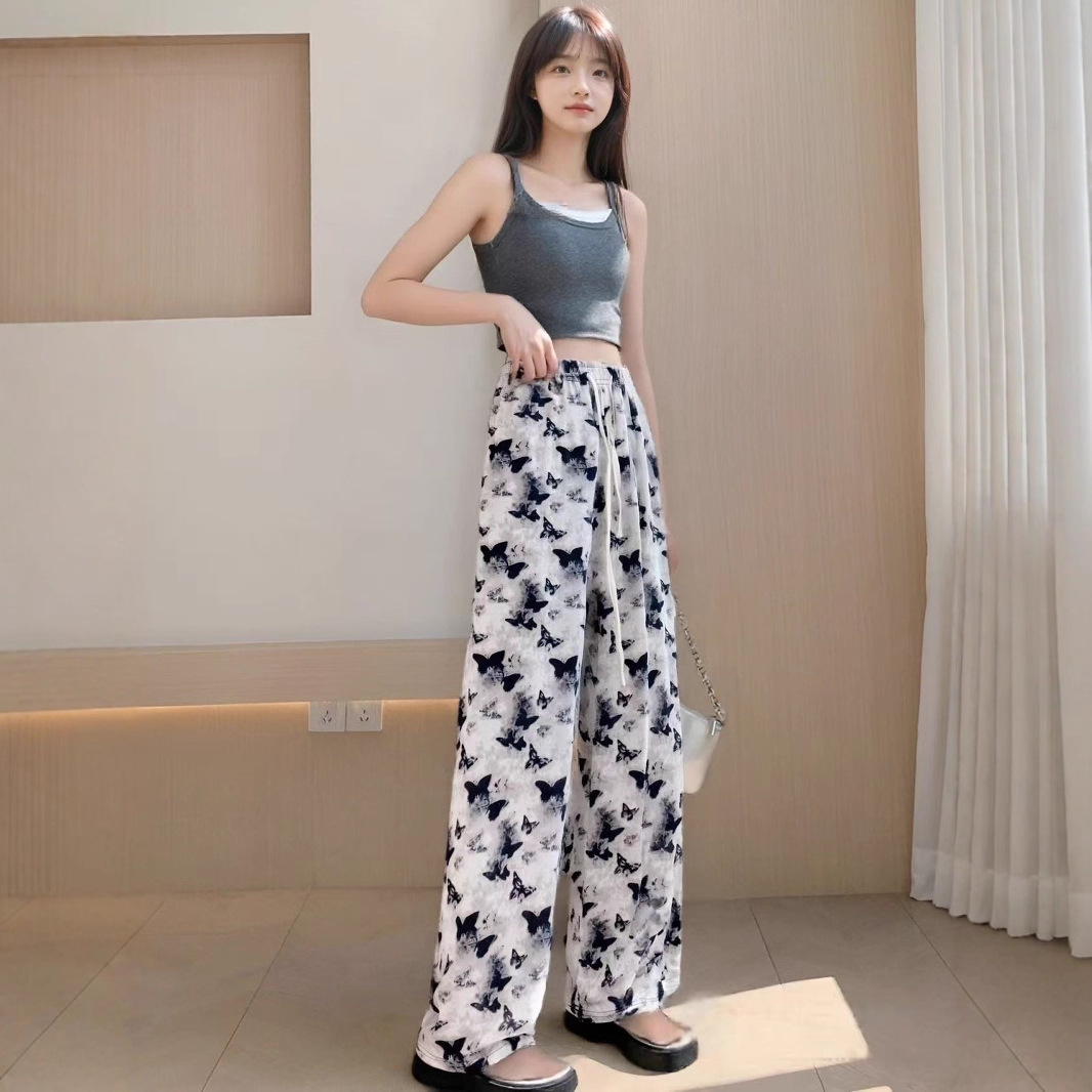 Celana Kaki Lebar Sutra Dingin Bunga Celadon Bercorak Retro Celana Anti Nyamuk Longgar Model Tipis Musim Panas Wanita Celana Kasual Berwarna Setrum Ukuran Besar