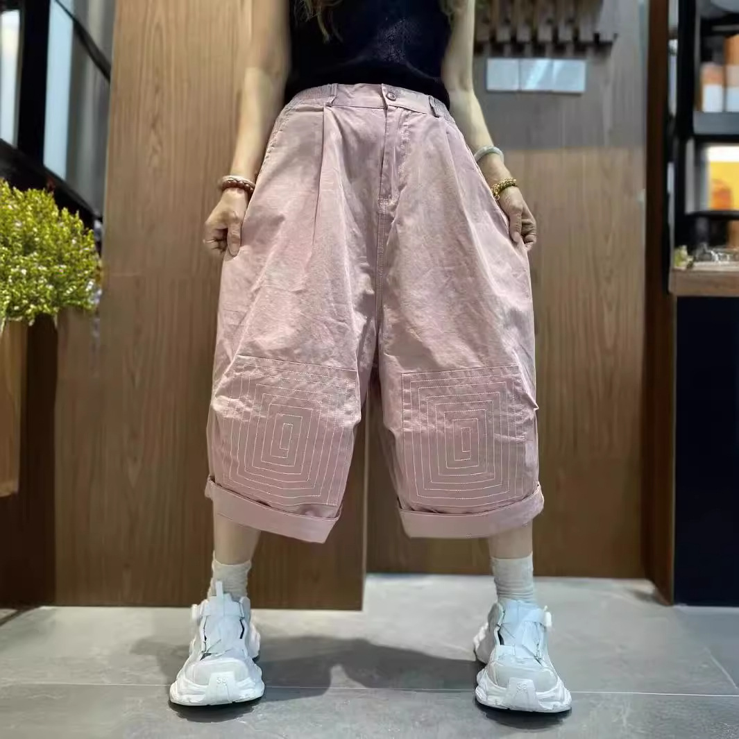 Celana pendek longgar ukuran besar wanita, celana pendek longgar gaya Korea tipis kaki lebar, celana kasual panjang sedang serbaguna Musim Panas 2024