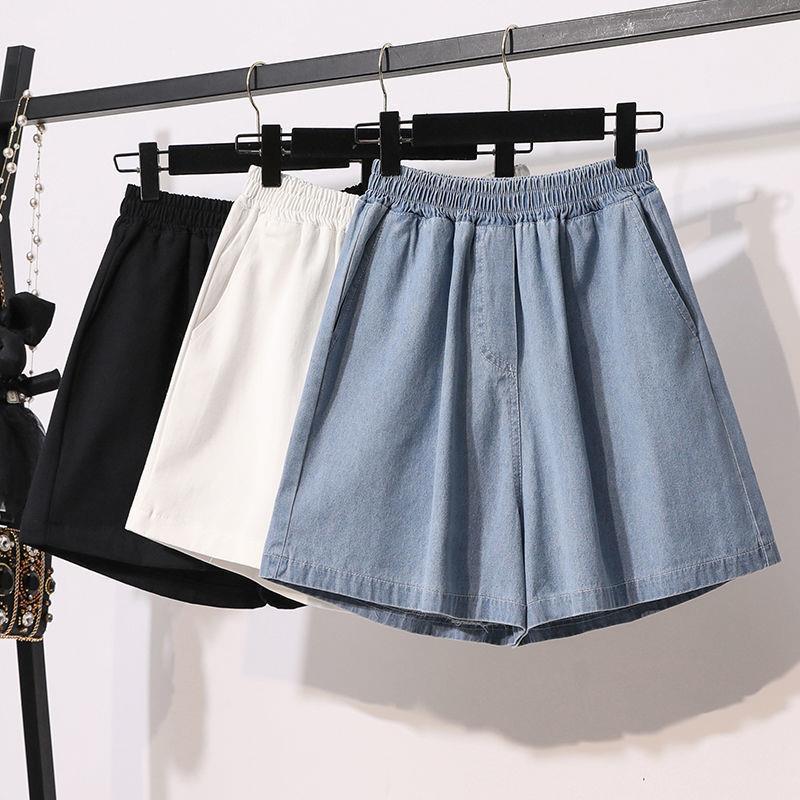 Celana pendek ukuran Plus untuk wanita, celana pendek pinggang tinggi kasual musim panas bergaya Korea Eropa, celana pelangsing longgar untuk wanita