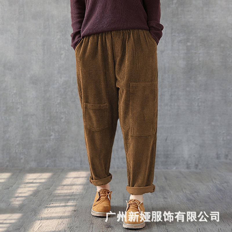 Celana wanita korduroi, celana panjang pelangsing wanita, celana pinggang elastis banyak saku warna polos musim gugur dan musim dingin