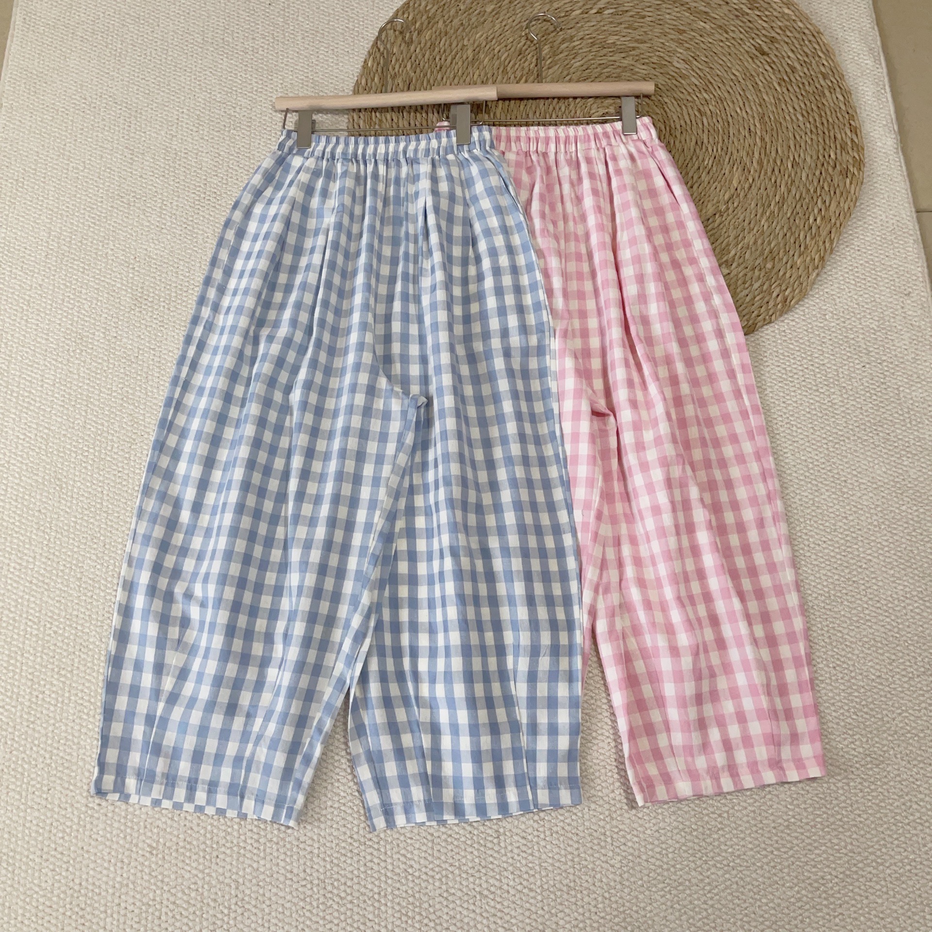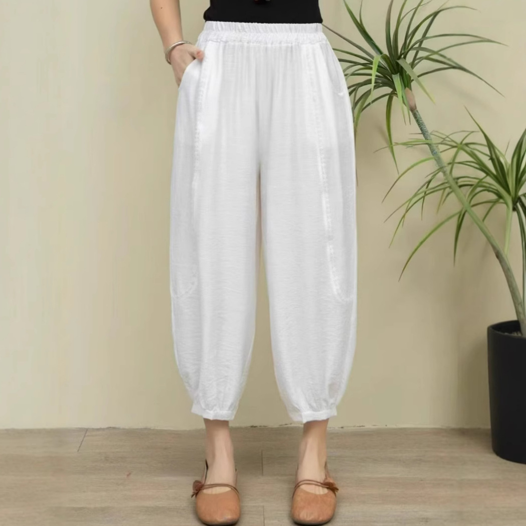 Real shot dalam stok Musim Panas 2024, gaya Korea katun dan linen ukuran besar celana crop longgar, kaki ketat, celana kasual untuk wanita