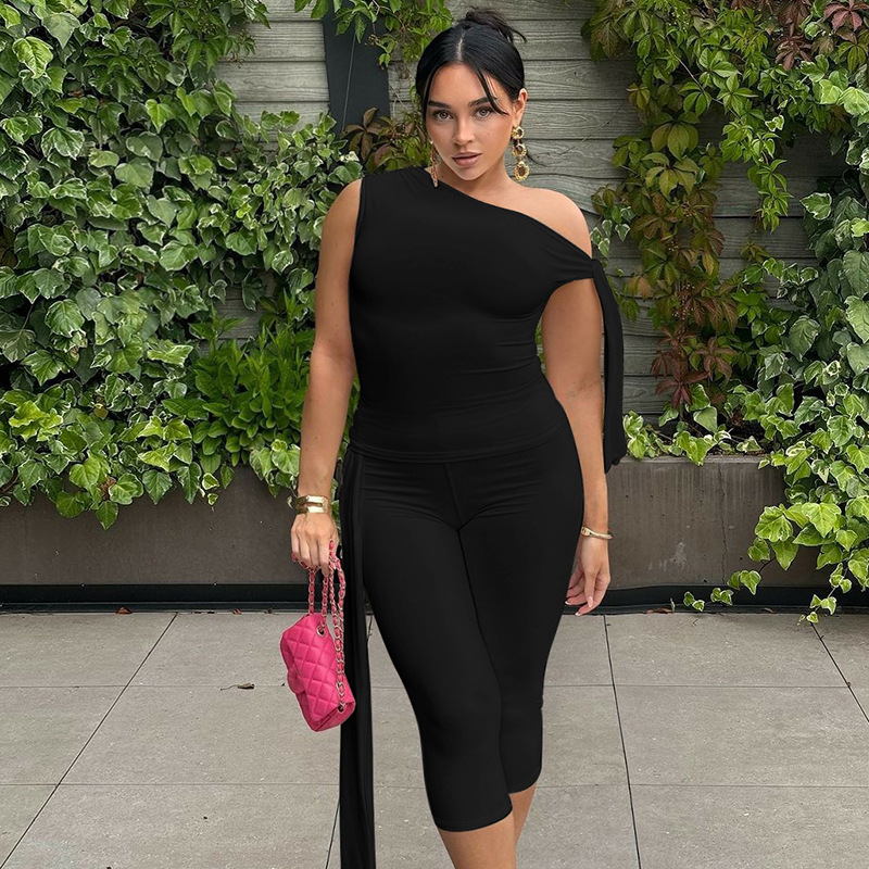 Pakaian Wanita Wanita Ukuran Besar Eropa Amerika Musim Panas 2025 Produk Baru Modis Slim Fit Bahu Tunggal Bertali Atasan Celana Pendek Warna Polos Set Grosir