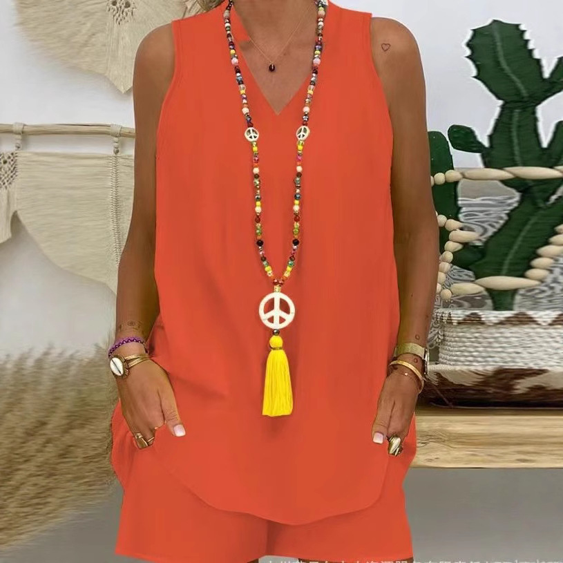 Pakaian Wanita Model Baru Warna Solid Kerah Tegak Tanpa Lengan Set Kasual 383