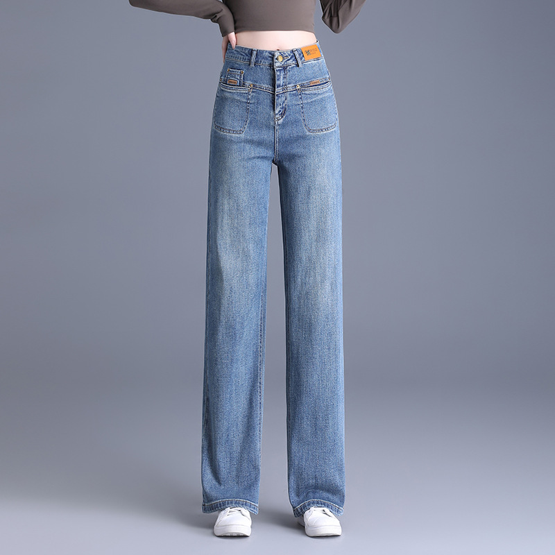 Celana jeans wanita musim gugur 2024 baru, longgar, ukuran besar, elastis, lurus, serbaguna, melangsingkan, potongan sempit dan lebar, celana panjang