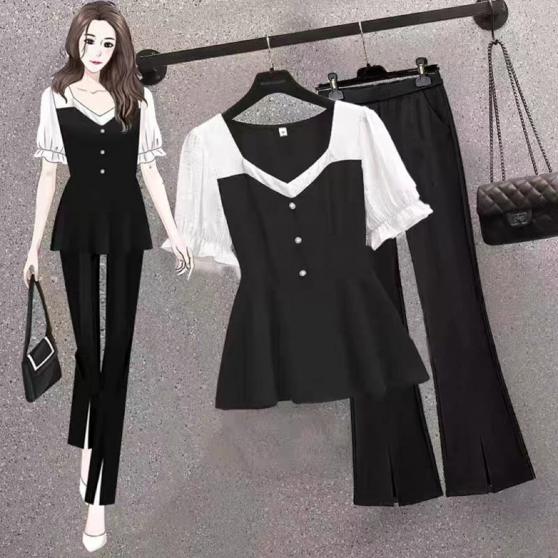 Setelan Profesional Elegan Pakaian Wanita Ukuran Besar Musim Panas Model Baru Celana Terompet Dua Potong Modis Menutupi Daging Terlihat Langsing Gaya Barat Wanita Gemuk