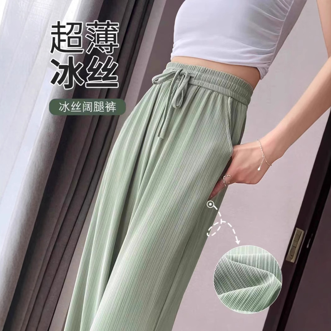 Celana Kaki Lebar Sutra Es Musim Panas Wanita Celana Kasual Pinggang Tinggi Longgar Model Tipis Musim Panas Celana Pel Lurus Terlihat Langsing Terdalam Ukuran Besar