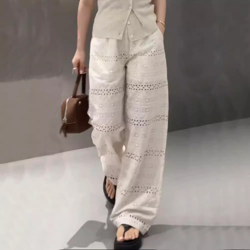 Pakaian Wanita Ukuran Besar Celana Lurus Kasual Berongga Model Tipis Pinggang Tinggi Musim Panas Celana Lebar Kaki Mudah Dipadu Padan Terlihat Kurus Longgar Wanita Berukuran Besar