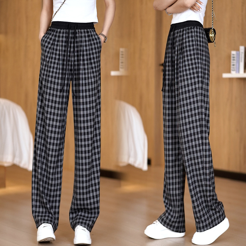 Celana Kaki Lebar Kotak-Kotak Pinggang Tinggi Celana Kasual Model Tipis Musim Panas Celana Lurus Wanita Terlihat Langsing Ukuran Besar Longgar Mengurangi Usia Mudah Dipadu Padan
