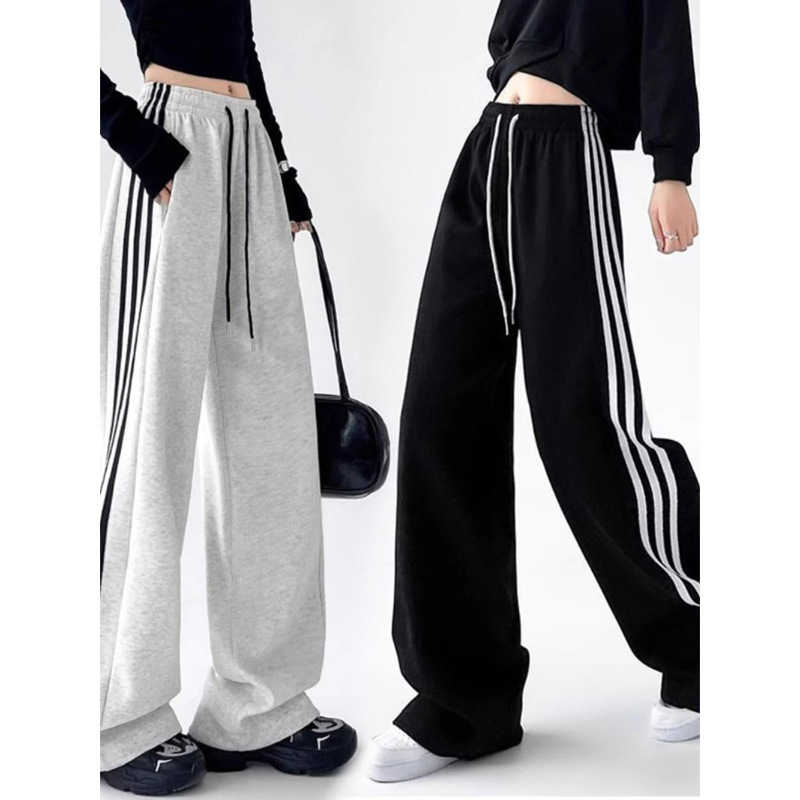 Celana Olahraga Tiga Garis Ukuran Besar 300Kg Wanita Musim Semi Musim Panas Model Tipis Gaya Amerika Bergaris Celana Kaki Lebar Longgar Kasual