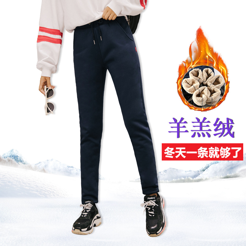 Celana olahraga wanita, celana olahraga tebal berlapis bulu musim gugur dan musim dingin gaya Korea longgar ukuran plus celana katun hangat celana kasual