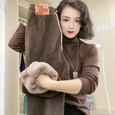 Celana katun beludru wanita, celana kecil lurus tebal berlapis bulu kasual pinggang tinggi ukuran ekstra besar musim semi dan musim gugur