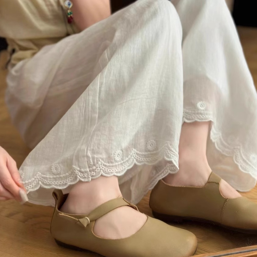Celana Lurus Terlihat Ramping Longgar Bertali Pinggang Elastis Model Baru Musim Panas 2025 Celana Kasual Dua Lapis Rami Sulaman Artistik Wanita