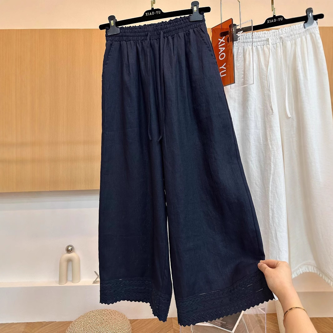 Ukuran Khusus 240Kg Barang Eropa Celana Kasual Wanita Longgar Rami Kombinasi Bordir Berongga Modis Gaya Senior Musim Panas